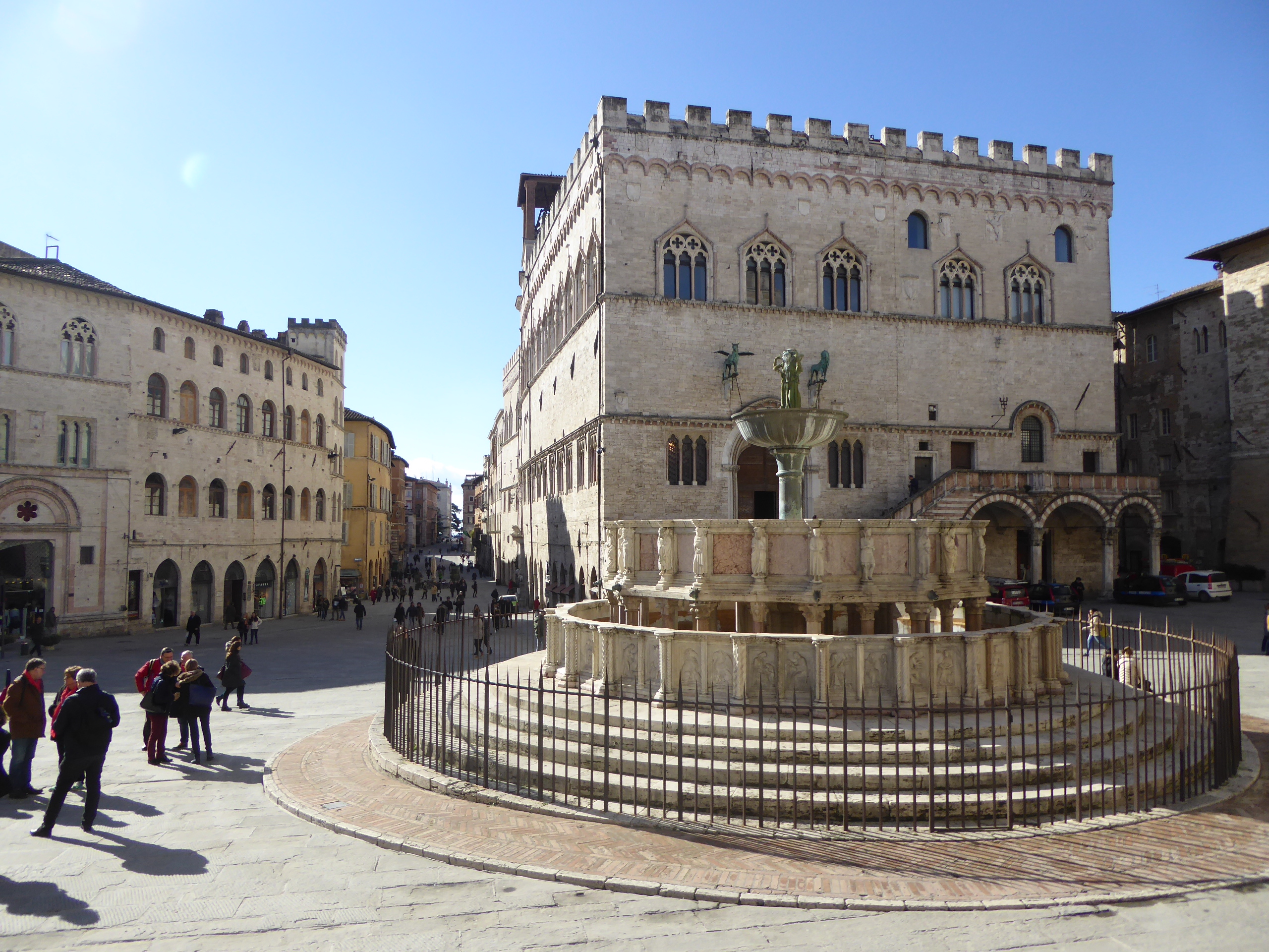 La construction du Palais des Priori a débuté en 1293 sous l’impulsion de Giacomo di Servadio et Giovanello di Benvenuto dans le but d’abriter l’administration de la ville de Pérouse. Le palais assez sobre d’extérieur abrite la galerie nationale d’Ombrie qui réunit la plus grande collection d’œuvres d’art parmi lesquelles des tableaux de Duccio, Piero della Francesca, Pinturrichio, fra Angelico et le Pérugin.